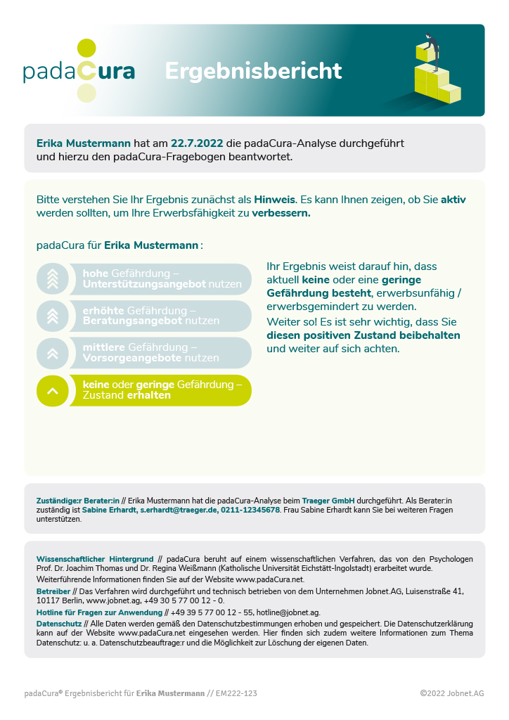 Der Algorithmus des padaCura errechnet im Ergebnis einen Score, der in eine vierstufige Warnampel eingeordnet wird. So erhalten Ihre Kund:innen einen übersichtlichen Blick auf ihren individuellen Gefährdungsstatus und erste Hinweise darauf, was sie jetzt machen und an wen sie sich wenden können, wenn sie Unterstützung benötigen.